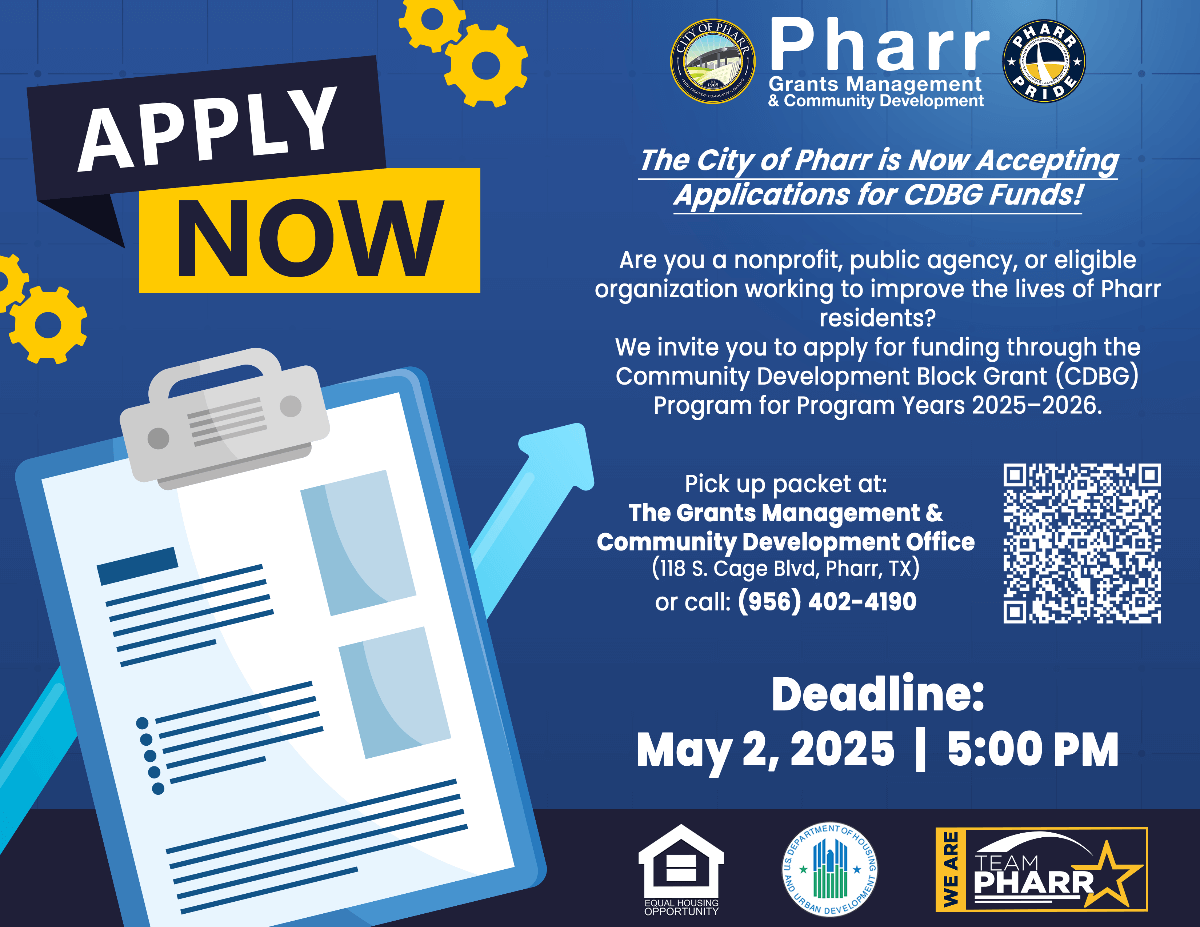 The City of Pharr’s Grants Management & Community Development Department is now accepting applications for the Community Development Block Grant Program for Program Years 2025–2026.